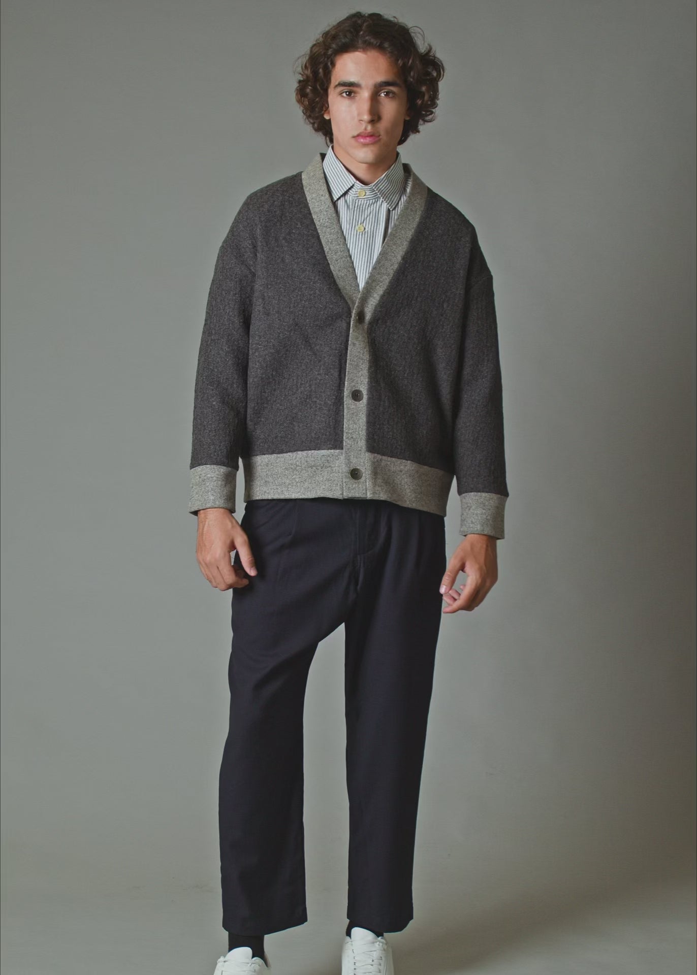 This two-tone cardigan draws inspiration from mid-century style, offering a perfect blend of nostalgia and 'grandpa-chic.' This piece is crafted from 100% Scottish wool and promises unmatched durability and long-lasting wear. In true Descendant of Thieves fashion, it's unnecessarily well-made, destined to be rediscovered by your unborn grandchild in future vintage shops that don’t yet exist. We finished the interior with a classic oxford stripe shirting fabric... just because we can.