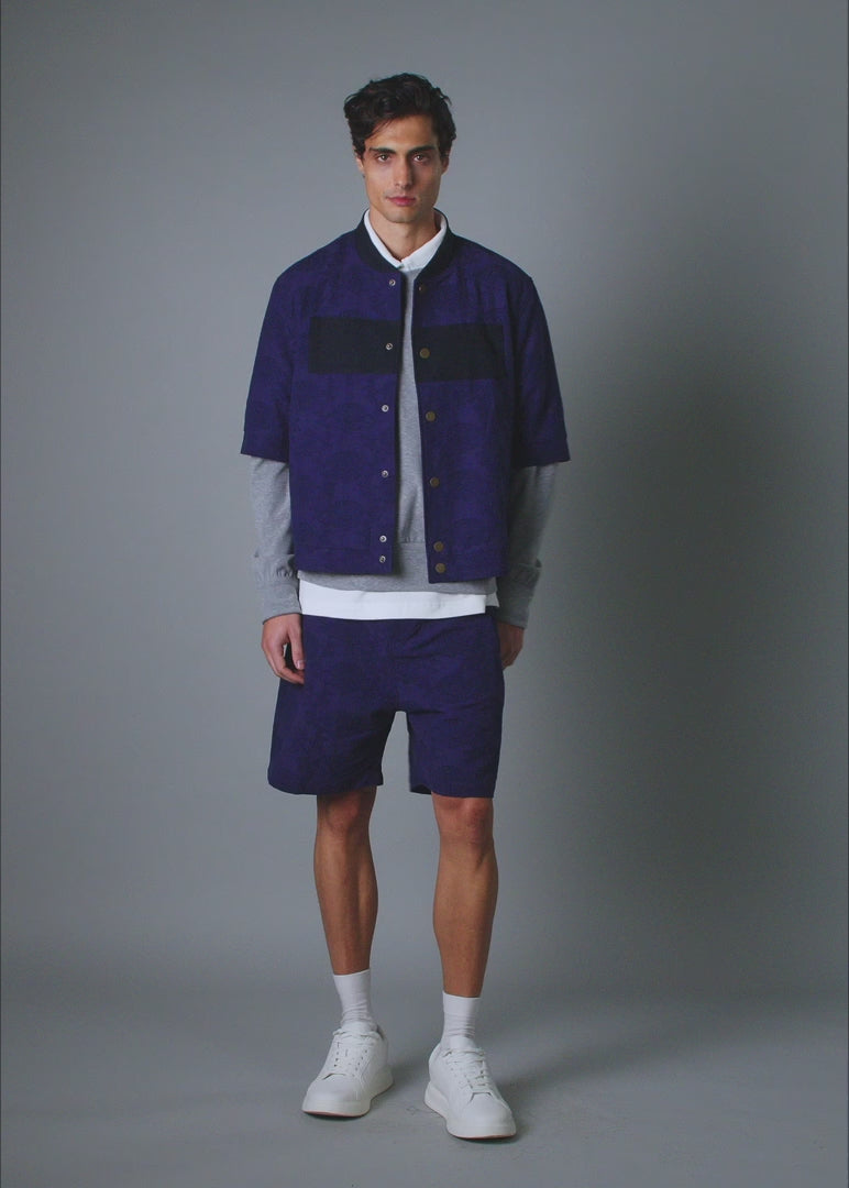 A short-sleeve, snap-front bomber. Cropped. Clean. A standout layering piece. A unique find that can be paired with matching shorts. Crafted in a deep indigo fabric. Woven with an all-over floral jacquard pattern. Rich in texture. Subtle in statement. The cropped silhouette is finished with our signature Anti-Logo Patch, a blank rectangle where a logo should be. It’s a quiet protest against loud branding. Made for those who identify as the black sheep. The ones who need not fit in. Note: This item is intentionally designed as a cropped style.