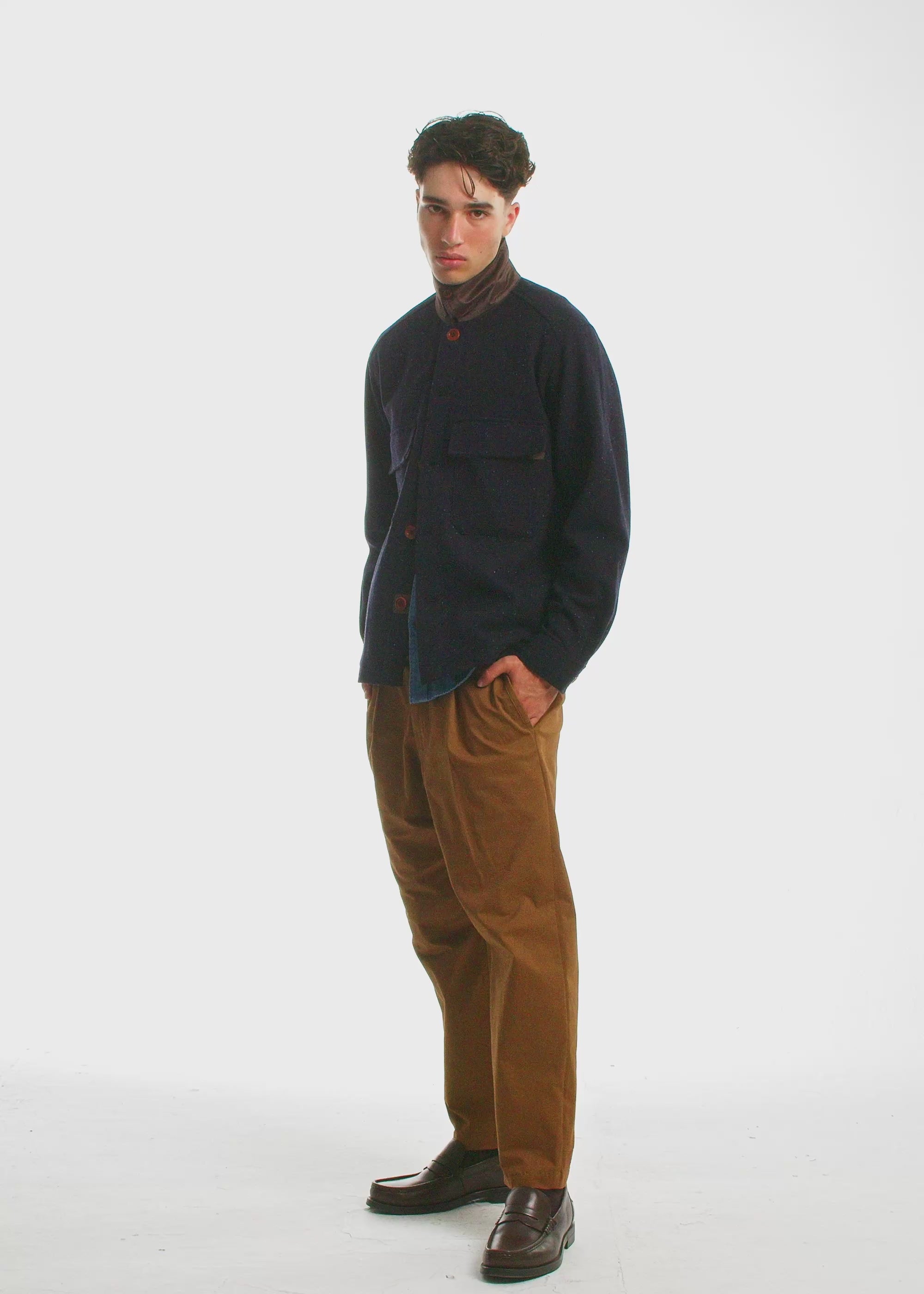 This shirt jacket is cut from authentic Scottish Donegal tweed. Known for its signature flecks of color. Subtle hits of blue and red against a deep navy base. The texture is coarse but refined. Structured drape that holds its shape. Oversized flap pockets nod to utility. Premium corozo buttons add unexpected contrast. Carved from a palm tree nut. Hard as bone. Smooth as ivory. Easy on enviorment. Only 150 made: Love thy Neighbor, but dammit, don't dress like them.