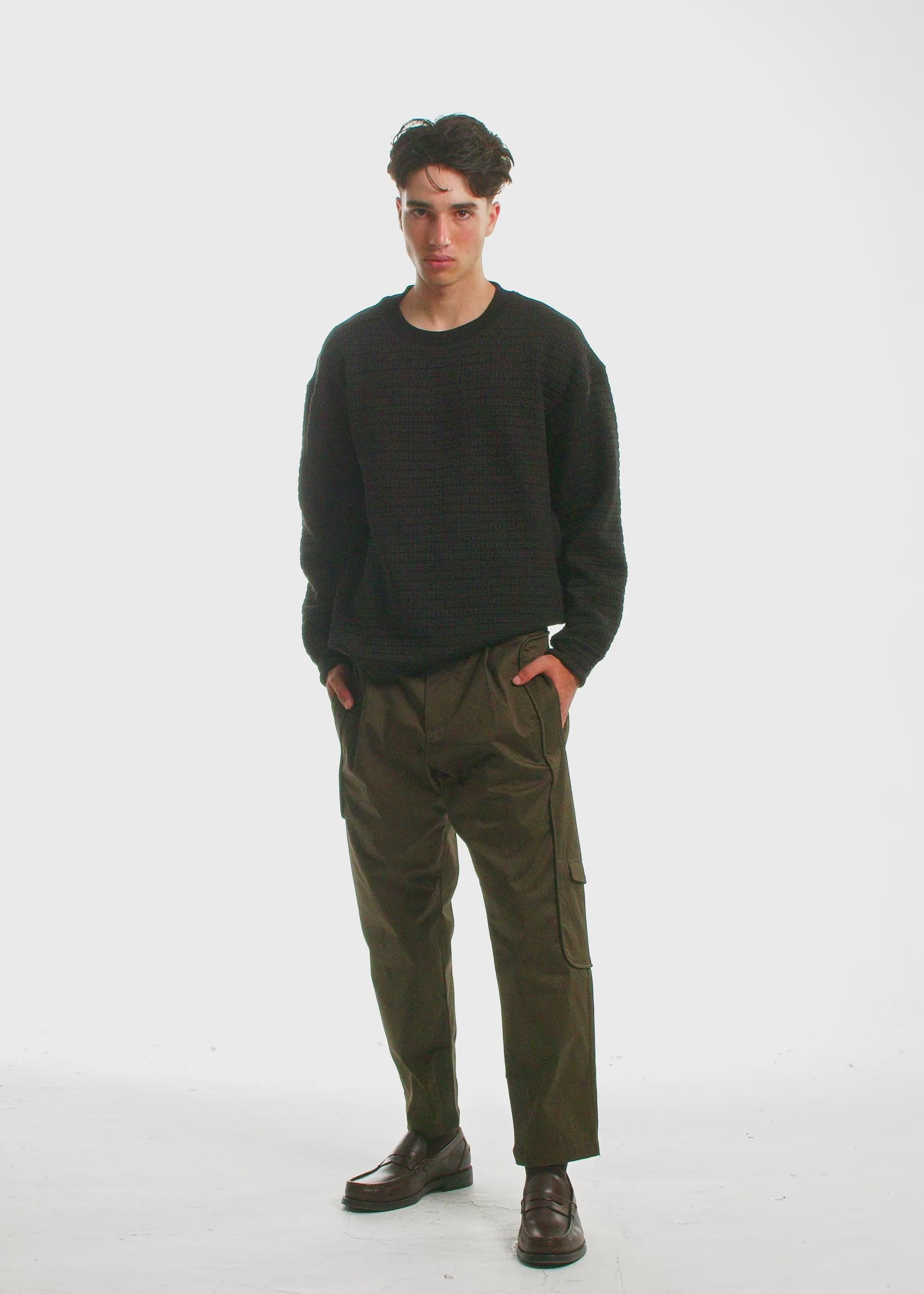 This piece is crafted from a jacquard knit fabric with a geometric grid texture. The pattern is engineered directly into the fabric using a jacquard loom, creating raised squares for added dimension. The weave creates a more distinctive way to wear a solid color, making it a great alternative to a solid plain weave item. It's a statement piece disguised as a solid. The back features our Exterior Shadow Label: a discreet rectangular patch that shadows the silhouette of our interior label. No logo, only a silent mark of belonging for those who wear Descendant of Thieves.
