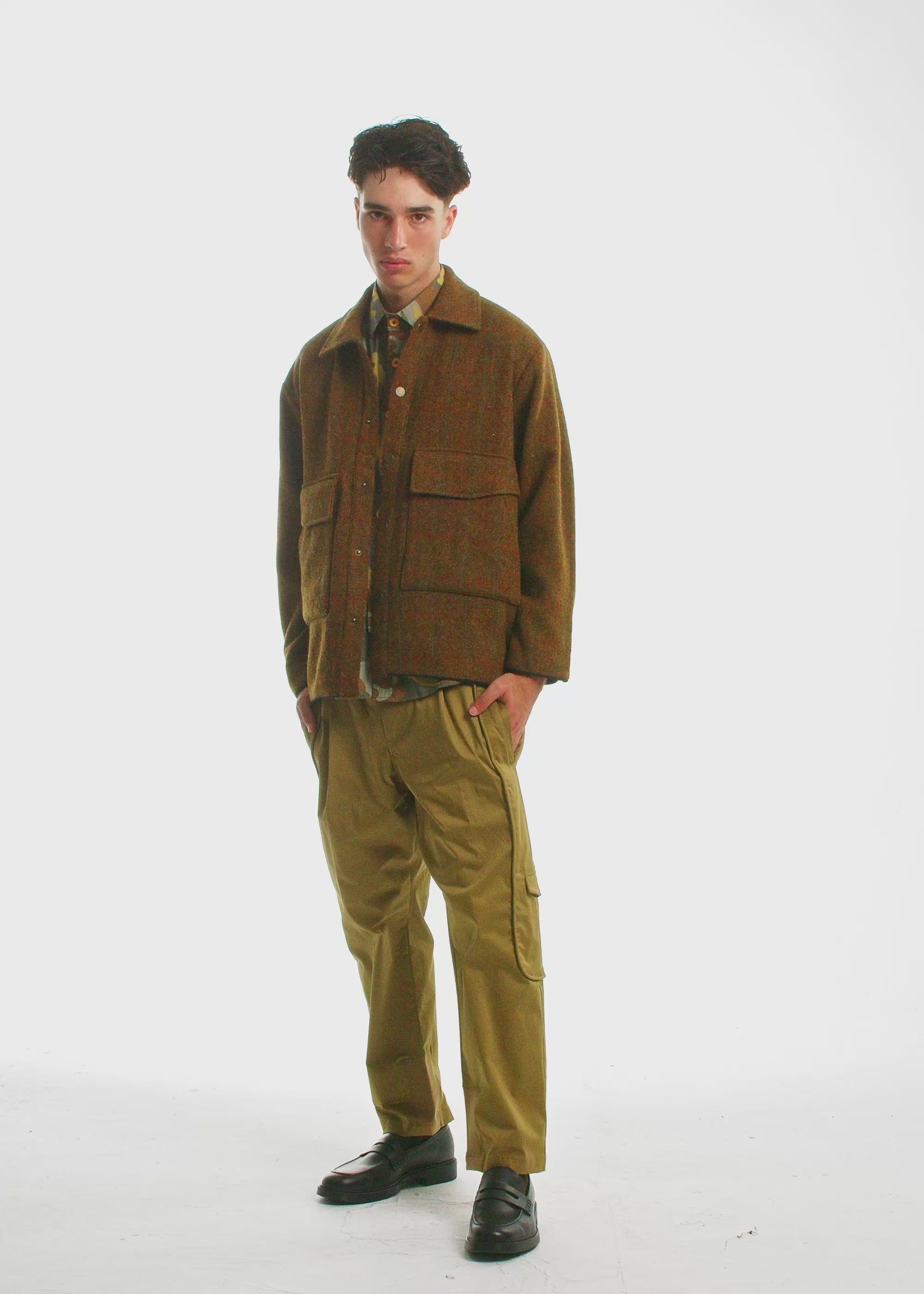 Cut from rich Scottish wool in a warm, autumn-toned herringbone weave. Scottish wool has been woven for centuries in the Highlands, where harsh weather demanded cloth that was both warm and nearly indestructible. By the 18th century, it had become the fabric of choice for both clans and aristocrats. It carries a legacy of durability, refinement, and prestige. The front pockets feature a double-entry design, allowing for both top flap and hidden side access for added functionality without extra bulk. Snap buttons keep the closure clean, while the cut stays slightly boxy for a structured feel.