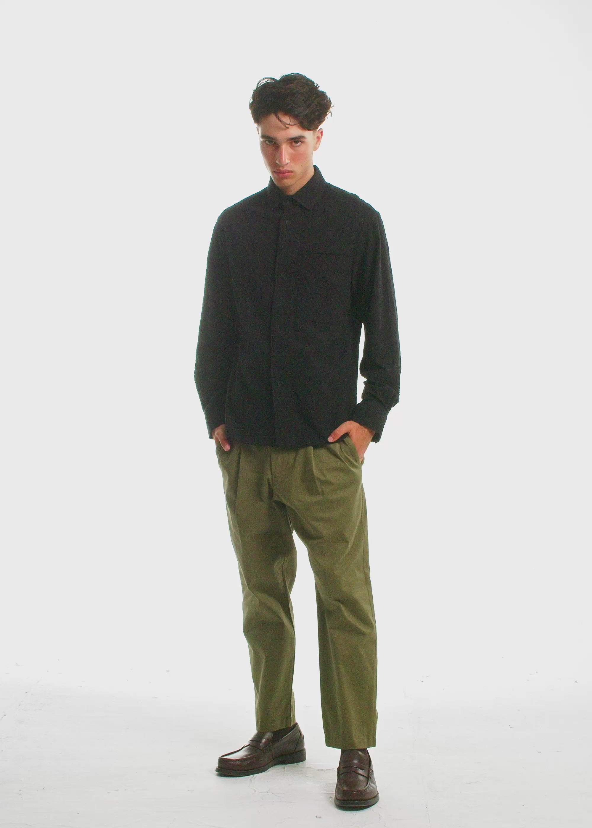 This shirt features a rich tonal floral embroidery, stitched layer by layer in a custom pattern. Each thread builds into the fabric, creating raised texture and depth that honors an ancient art form. The result is a shirt that stands in a category of its own. It redefines the solid: not flat, not plain, but alive with sculptural texture. A statement piece disguised as minimal. This is not just an addition to your wardrobe, it’s an addition to your art collection.