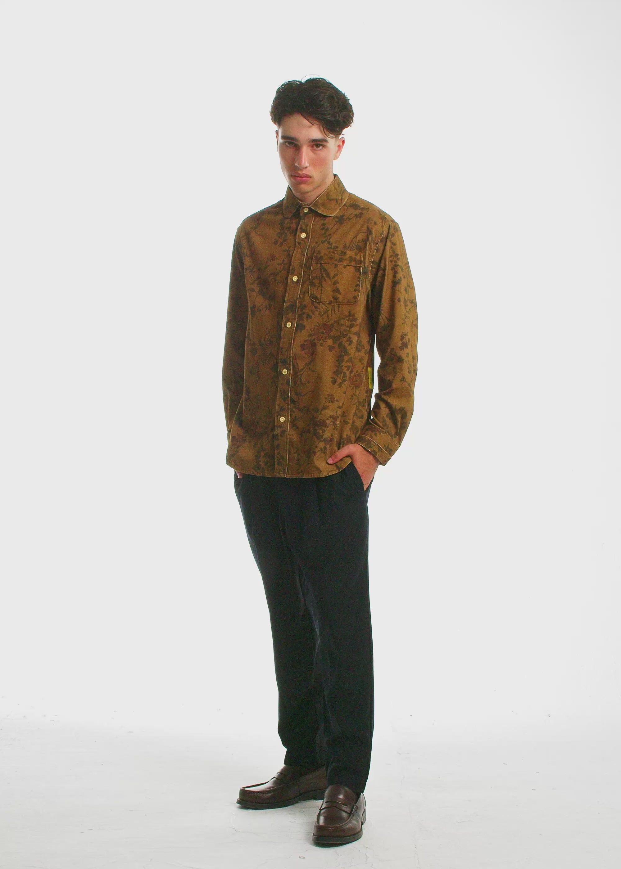 We call it Printed Chord because it strikes a different note. Cut from fine-wale corduroy. Soft, textured, and unexpectedly refined. Rugged workwear meets quiet luxury. An intentional contradiction. The surface carries a tonal floral print, almost ghosted into the fabric. The artwork is an installment in our Darkness Falls collection. A series of dark, moody, mysterious prints. Made for those with an edge.