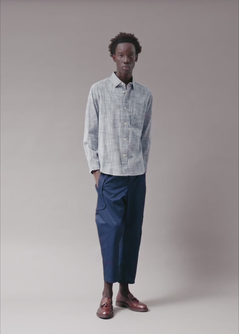 Quiet texture. Strong presence. This cross hatch fabric is a great alternative to a flat solid shirt, adding depth through weave, not print. Subtle from a distance, intentional up close. Soft to the touch. The floating front placket stops short of the hem. Intentional. Architectural. Unpredictable. The elongated chest pocket offers a point of difference. Its double layer construction adds subtle dimension, effortlessly setting you apart from the expected. Made unnecessarily well in limited batches.