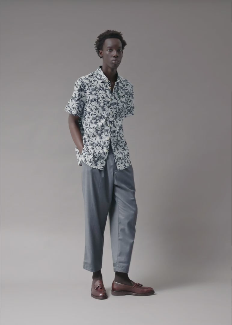 Monochrome florals. Rendered in tonal shades of slate and ash. Easy to wear. Hard to ignore. A white trace trim lines the back hem and runs up the side seams, framing the silhouette with edge. Almost hidden. A Descendant of Thieves signature move that separates you from everyone else. Made in small batches. No restock once it's sold out. Unnecessarily well made. No assembly lines. No shortcuts.