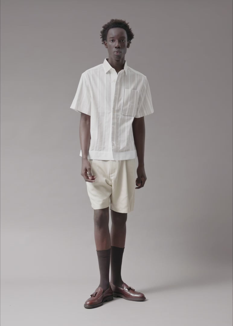This short-sleeve shirt is cut from a sheer, vertically striped fabric that is woven with alternating opaque and translucent bands. The base is a soft ivory tone, finished with warm contrast buttons and a clean chest pocket. The hem is subtly engineered for balance, giving it a tailored edge. The fabric is rare. The kind of textile that separates you from the room.