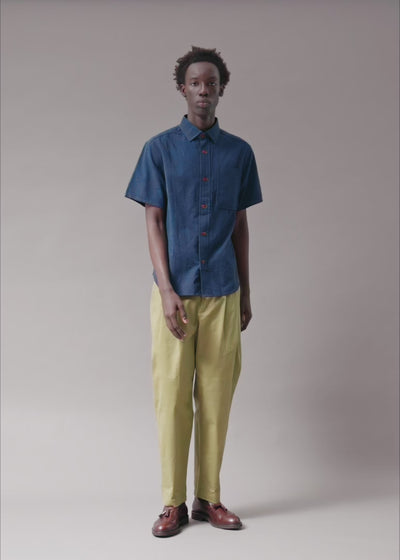 NavyClean at first glance, calculated up close. This shirt is built from a textured cotton weave that disrupts the idea of “plain.” The wide floating front placket stops short of the hem, crafted with such precision it appears almost impossibly suspended. Intentional. Architectural. Unpredictable. Minimalism, through a Descendant of Thieves lens.