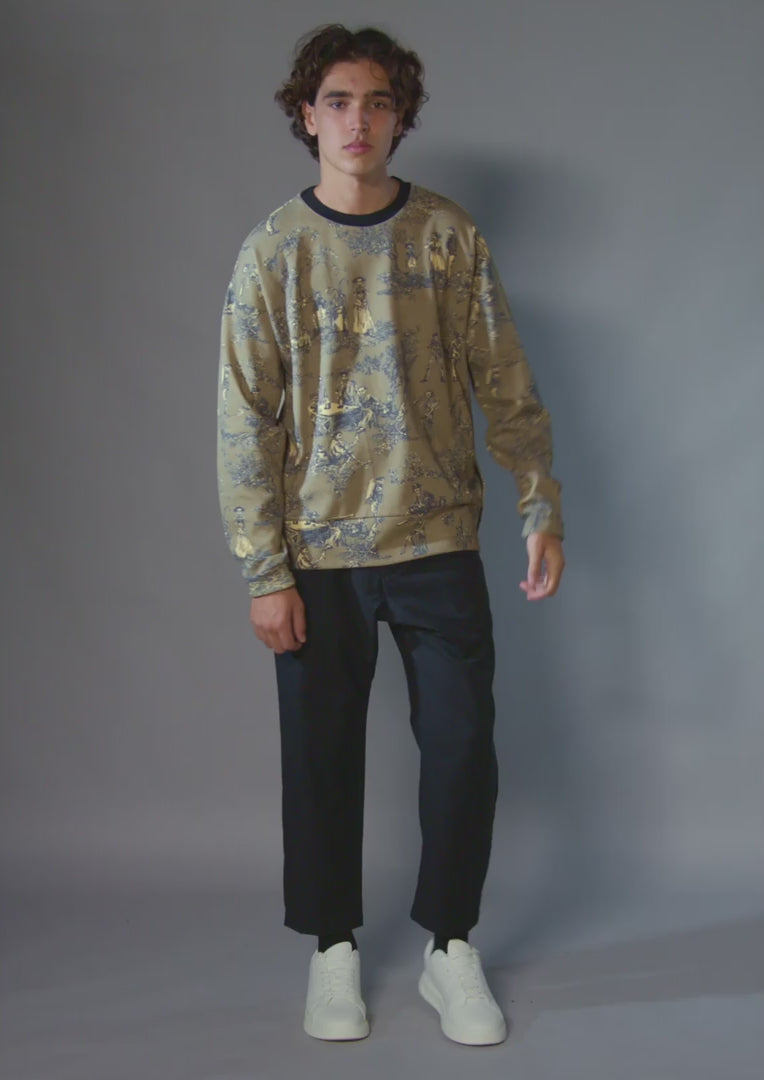 This crew neck features one of our signature prints: The Descendant of Thieves Toile. Traditional toile patterns, originating in late 18th-century France, was known for its intricate depiction of rural pastoral scenes. In our reinterpretation, the figures are represented as skeletons—a playful nod to the fact that the people portrayed from that era are long deceased. This twist adds a slightly morbid touch but is intended to playfully capture a bygone era. Over time, it has become one of the Descendant of Thieves brand motifs. A similar print decorates the wallpaper of our 203 Bleecker NYC store, reminding us that when we see death, we are reminded to live.